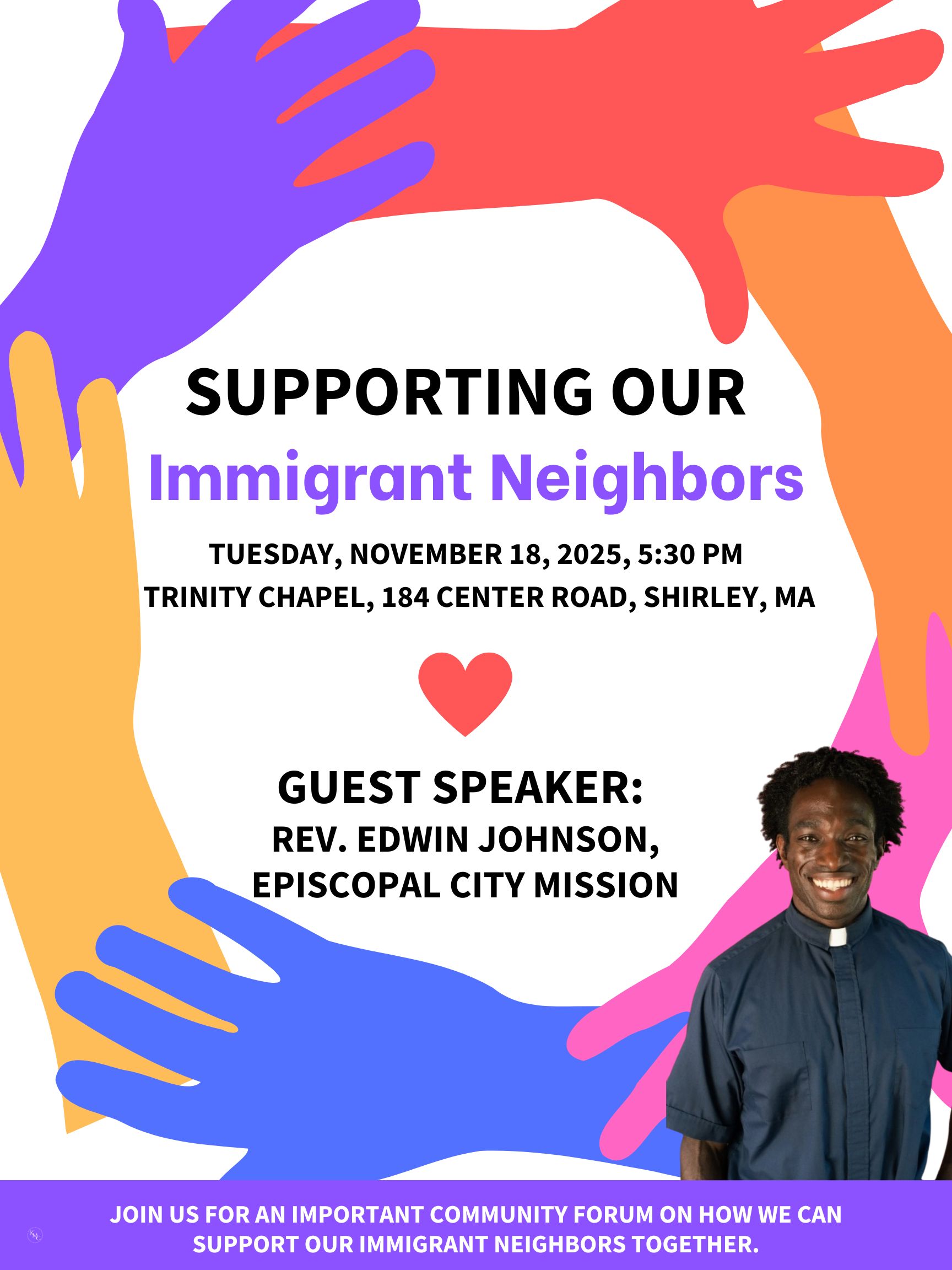 Trinity Chapel is hosting an important community forum on Thursday, November 6th at 5:30 PM. Representative Danilo Sena will lead a discussion on Immigration in Massachusetts: State Policy and Federal Uncertainty. This timely event offers our community an opportunity to learn about current immigration policies, understand how state and federal changes may affect our neighbors, and ask questions in a welcoming environment. Trinity Chapel is located at 184 Center Road in Shirley. All are welcome to attend this vital conversation as we seek to better understand and support one another in these uncertain times.